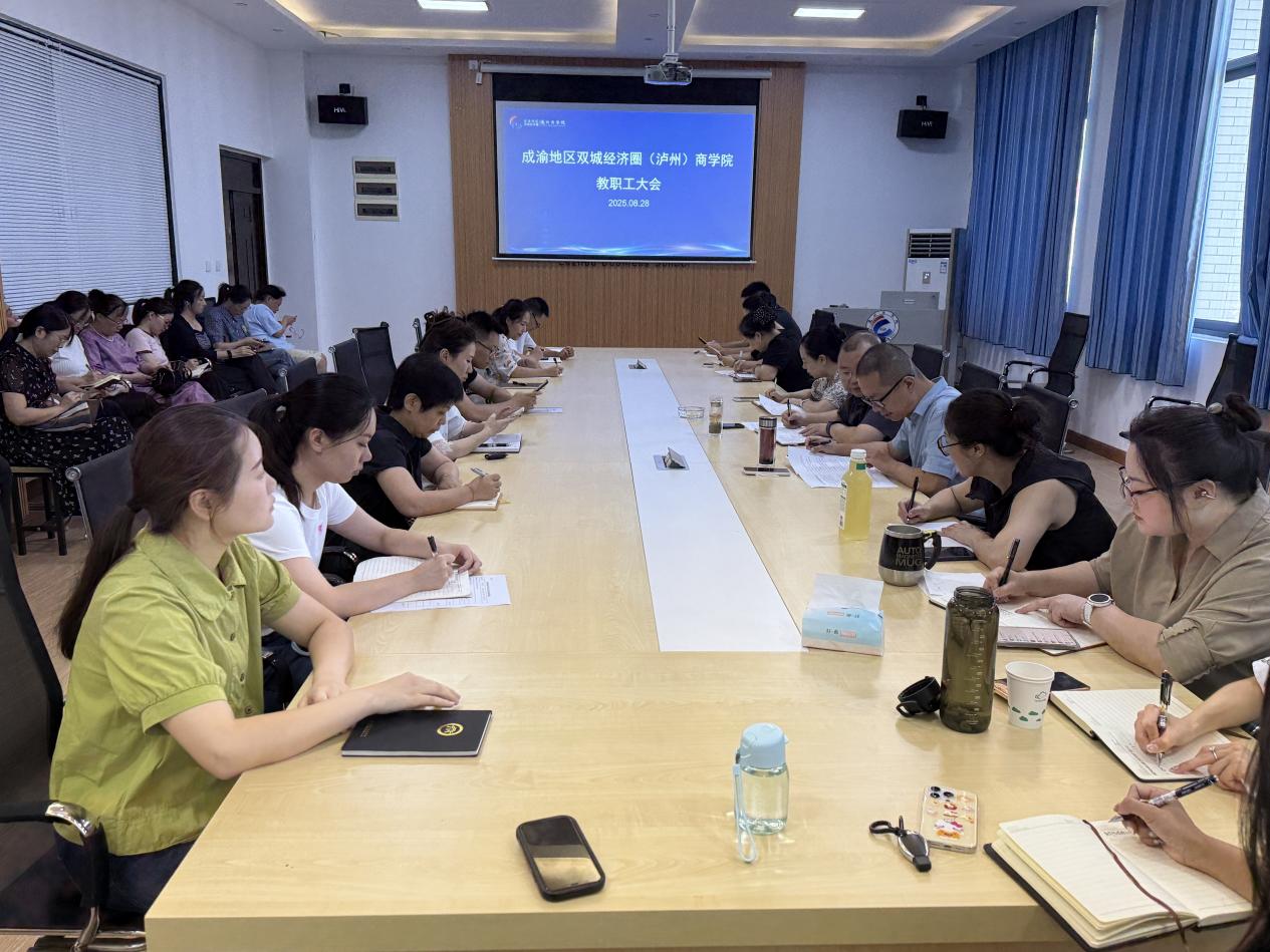 为深入贯彻习近平总书记关于教育的重要论述和教师队伍建设的系列指示批示精神,进一步加强学院师德师风建设,2025年8月28日上午9点,成渝地区双城经济圈(泸州)商学院在弘礼楼4518会议室组织召开全体教职工大会,专题学习《四川省高等学校教师师德评价考核办法》与《四川省高等学校教师师德失范行为处理实施细则》(以下简称“两个文件”)。学院党委副书记、院长刘昱聃主持会议,学院党委常务副书记、副院长吕宁领学了两个文件。